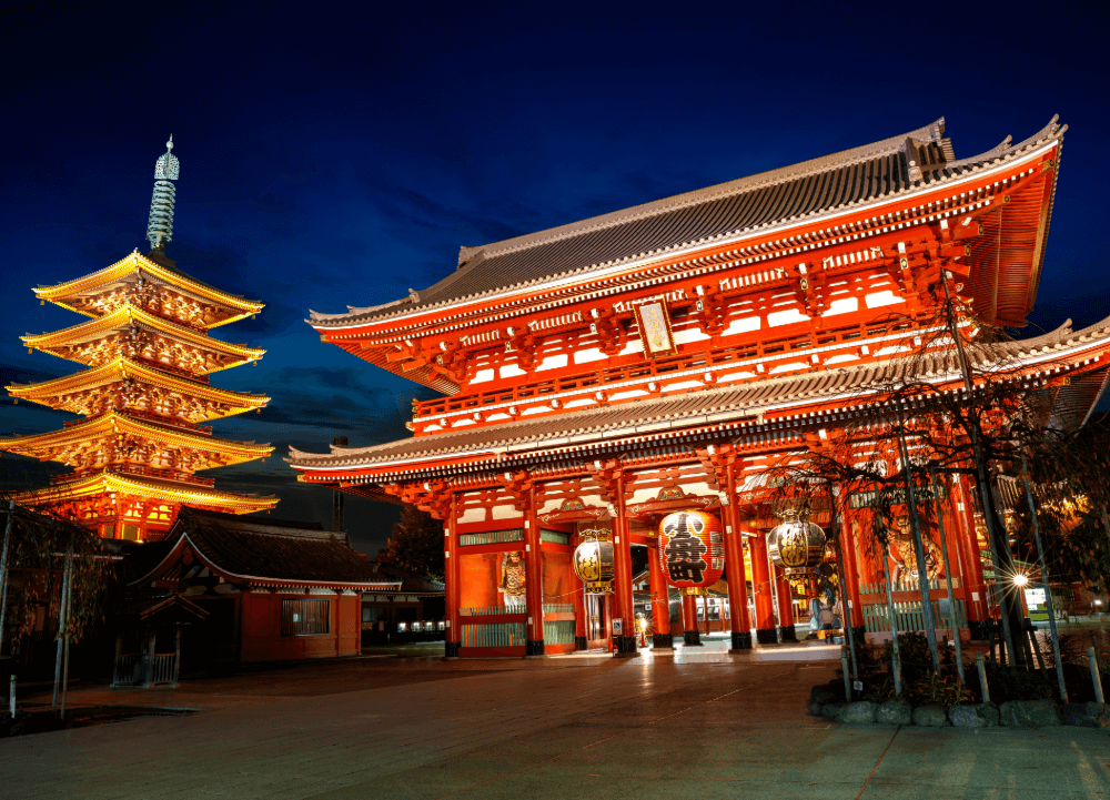 - Asakusa Kannon Temple (Senso-ji Temple): Tokyo’s oldest Buddhist temple, founded in 628 A.D., originally built around a statue discovered by two fisherman brothers in the Sumida River.